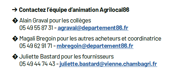 Vos interlocuteurs sur Agrilocal86: Alain Graval pour les collèges 05 49 55 87 31 Magali Brégoin pour les autres acheteurs et fournisseurs 05 49 62 91 76 ou 06 60 61 47 23 mbregoin@departement86.fr